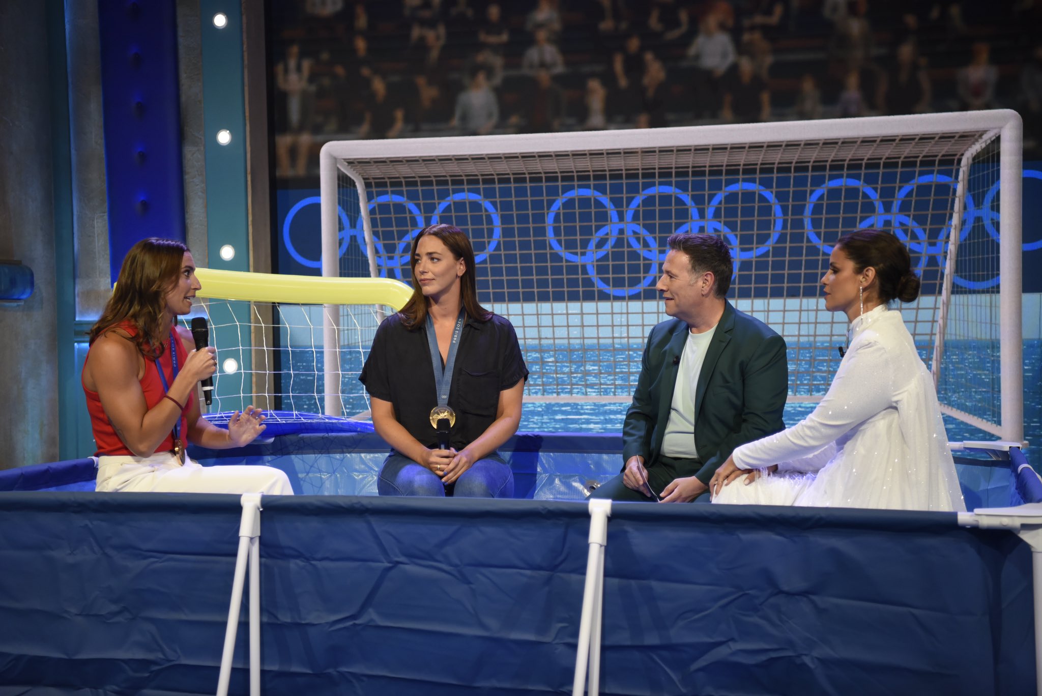 Entre los invitados se encontraban destacados rostros del deporte español, como los atletas Álvaro Martín y María Pérez, y las nadadoras artísticas Blanca Toledano y Paula Ramírez, quienes compartieron sus experiencias en París y relataron algunas anécdotas curiosas vividas durante la competición. Sin embargo, el momento más incómodo de la noche llegó durante la entrevista con Maica García Godoy y Bea Ortiz, quienes representaron a España en waterpolo femenino y se llevaron la medalla de oro. Fue entonces cuando Marta Torné, en medio de la conversación, cometió un error notable con su comentario. «Oye, lleváis medallas diferentes a la de vuestros compañeros, ¿no?», preguntó Torné, mientras se encontraba dentro de una piscina de plástico vacía en el set.