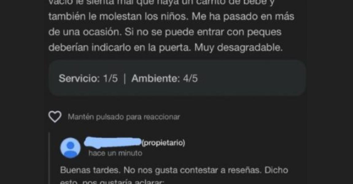 El tema se ha vuelto especialmente polémico tras un incidente en un bar, donde una clienta expresó su descontento públicamente por el trato recibido al acudir con niños. Según su relato, la camarera mostró una actitud desagradable hacia ella, el carrito de bebé y los niños presentes. La clienta sugirió que, si los niños no eran bienvenidos, el local debería indicarlo claramente en la entrada.