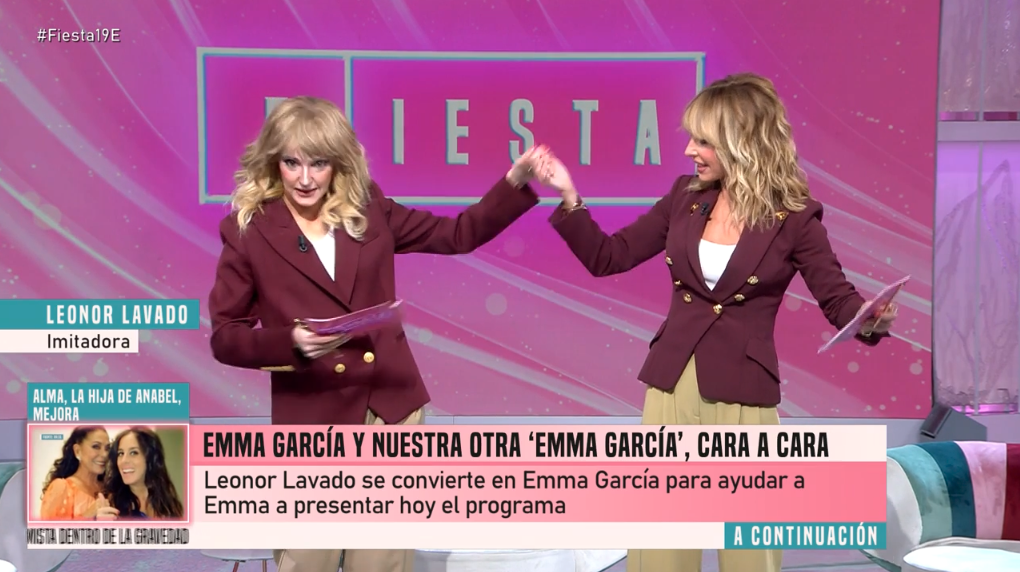 Todo comenzó con normalidad en un nuevo programa de Fiesta. Emma García, fiel a su estilo, saludaba a los espectadores y avanzaba los contenidos del día. Sin embargo, apenas unos minutos después, la tranquilidad del plató se vio interrumpida por la llegada de una segunda “Emma García”. La imitadora, Leonor Lavado, apareció vestida como la presentadora y replicando sus gestos y tono de voz, creando un momento tan surrealista como divertido.