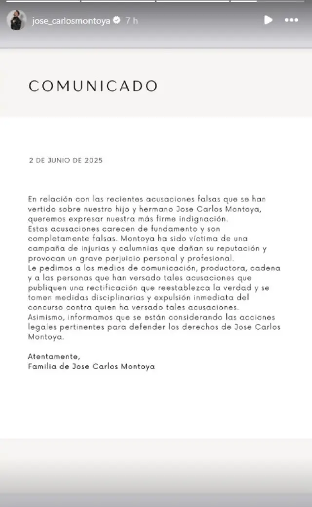 Frente a estas declaraciones, la familia del concursante ha roto su silencio con un comunicado que no deja lugar a dudas. En él, acusan a los responsables de propagar una mentira que afecta directamente a la integridad de Montoya. Y piden consecuencias.