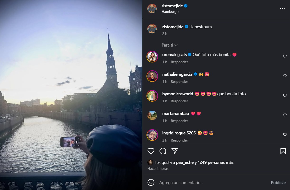 La noticia se filtró primero en redes sociales, ese escaparate donde las historias de amor empiezan a escribirse con emojis antes de confirmarse con imágenes. Hace unos días, ambos compartieron una fotografía desde un puente de Hamburgo, con el sol cayendo detrás y el rumor del río como testigo. Risto escribió que vive «un sueño de amor», un Liebestraum —como él mismo lo llamó—, confirmando así que el rumor era cierto y que la historia había comenzado oficialmente.