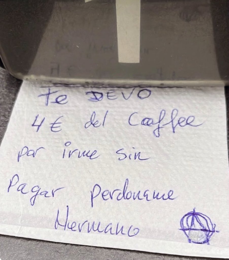 La última historia que ha incendiado las redes tiene aroma a espresso y tinta de bolígrafo. En X —la red antes conocida como Twitter— se ha compartido la imagen de una nota encontrada en un bar que dice: «Te debo cuatro euros del café por irme sin pagar. Perdóname, hermano». La frase, escrita sobre una servilleta con faltas ortográficas y un símbolo anarquista, ha generado una mezcla de risa y desconcierto.
