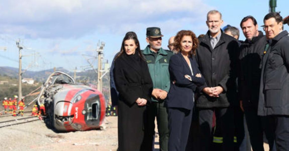 En la instantánea se observa a los Reyes junto a la vicepresidenta María Jesús Montero, el ministro Óscar Puente, el presidente de la Junta de Andalucía, Juan Manuel Moreno Bonilla, y un mando de la Guardia Civil. Todos aparecen observando el tren Alvia siniestrado —que no se muestra directamente— mientras, al fondo, se distinguen los restos del convoy de Iryo volcados y a los bomberos aún trabajando en la zona.