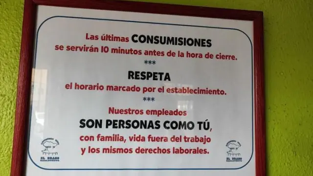 Junto al cartel exterior, El Drago cuenta con otro mensaje en el interior que ha captado la atención. En este se avisa de que «las últimas consumisiones se servirán 10 minutos antes de la hora de cierre», seguido de un recordatorio a los clientes: «Nuestros empleados son personas como tú, con familia, vida fuera del trabajo y los mismos derechos laborables». Un texto que busca que los clientes comprendan la importancia de respetar los horarios.